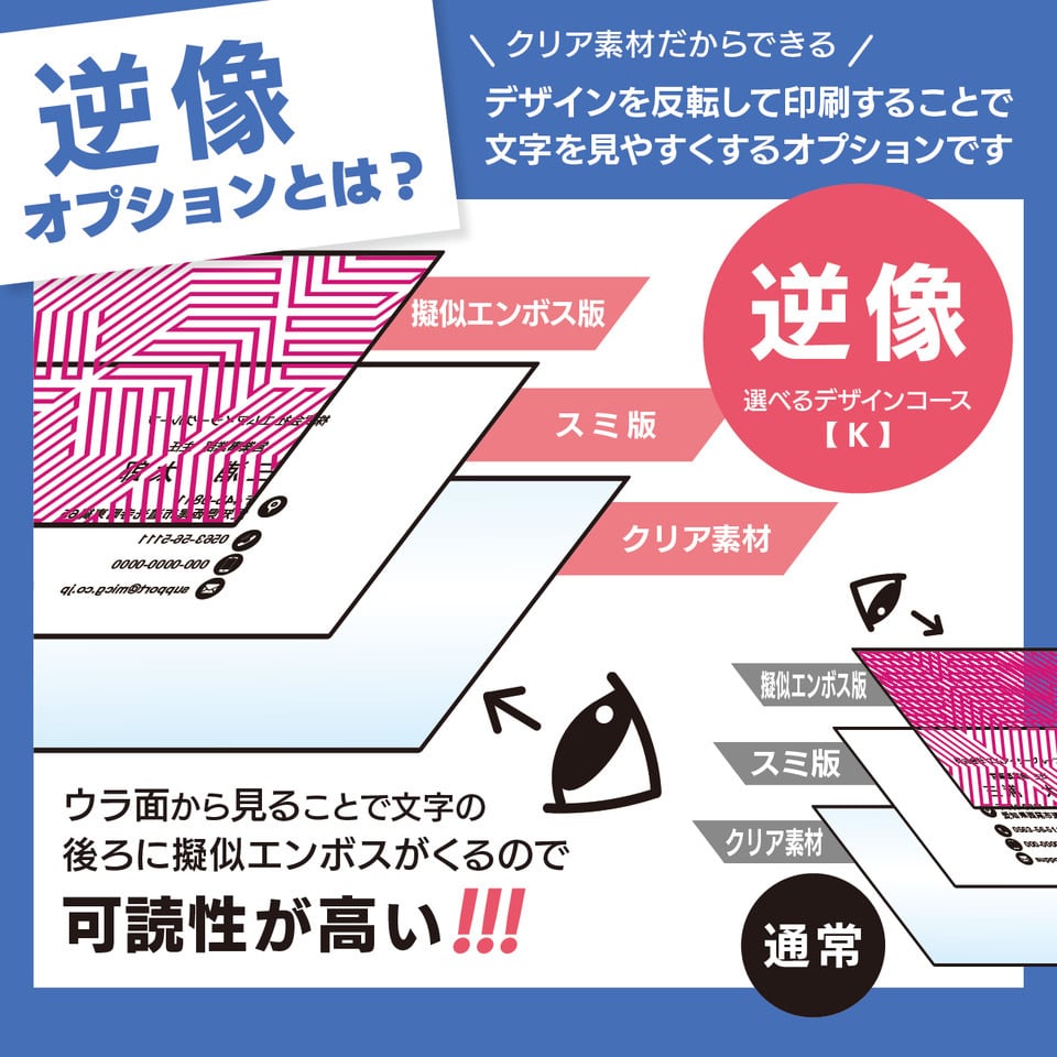 プレミアムクリア名刺(擬似エンボス印刷×クリア名刺):K 選べるデザインコース(1箱110枚8,800円、2箱220枚12,100円)