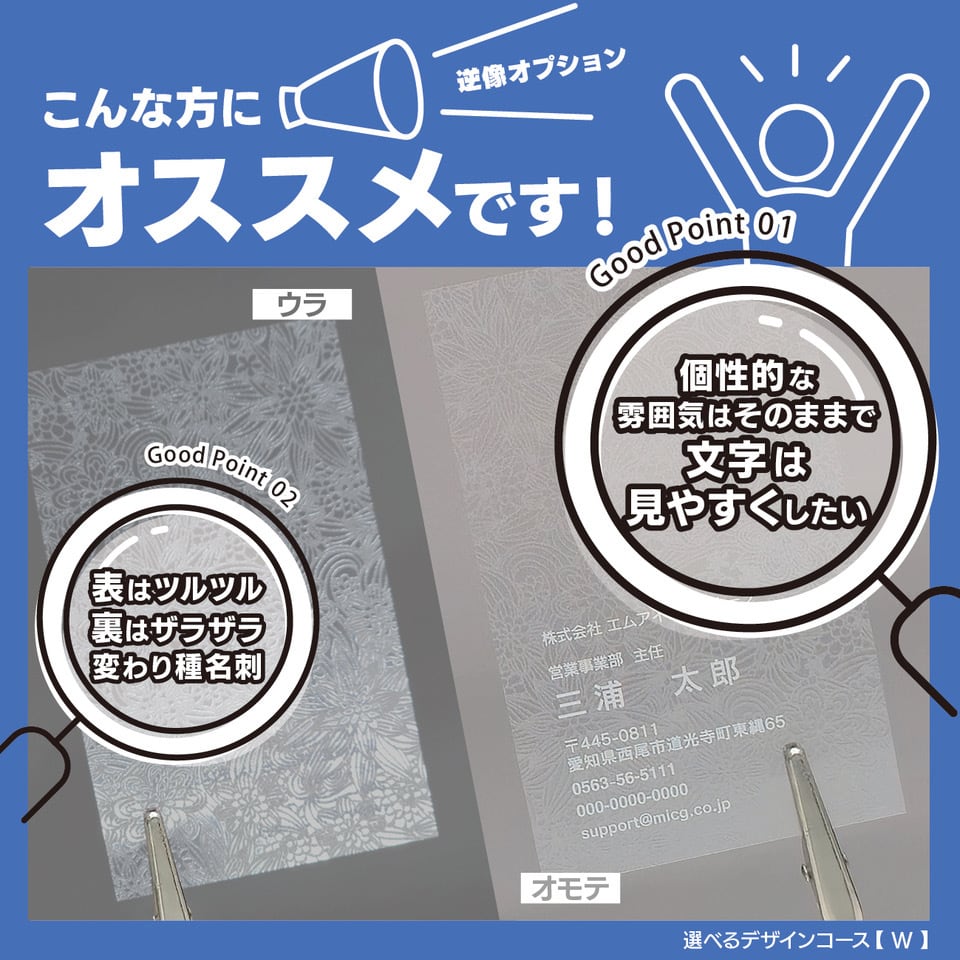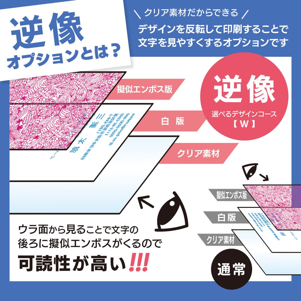 プレミアムクリア名刺(擬似エンボス印刷×クリア名刺):W 選べるデザインコース(1箱110枚8,800円、2箱220枚12,100円)