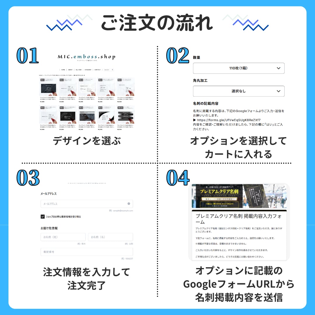 「お名刺作成に必要な情報」は「オプション」に記載のGoogleフォームURLにアクセスしていただきご入力・送信をお願い致します。