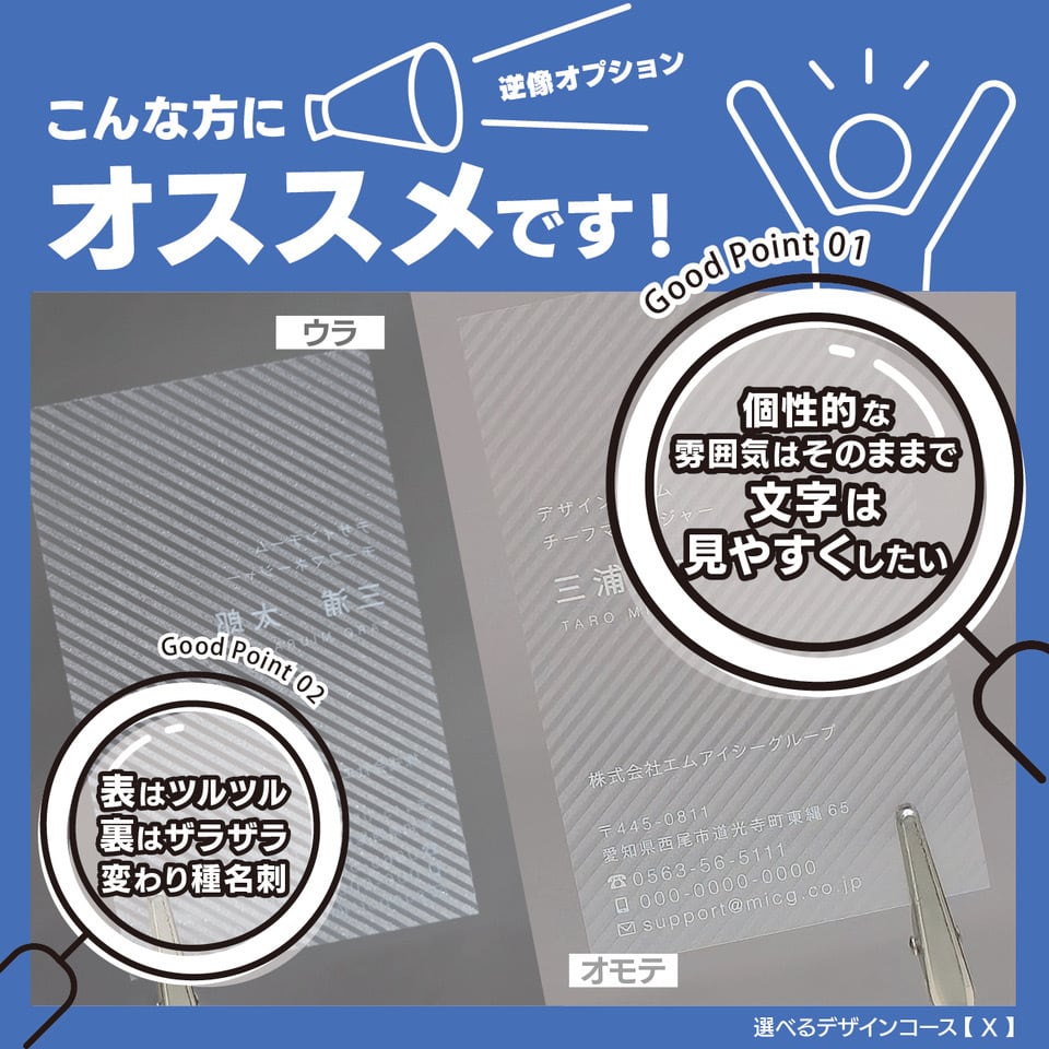 プレミアムクリア名刺(擬似エンボス印刷×クリア名刺):X 選べるデザインコース(1箱110枚8,800円、2箱220枚12,100円)